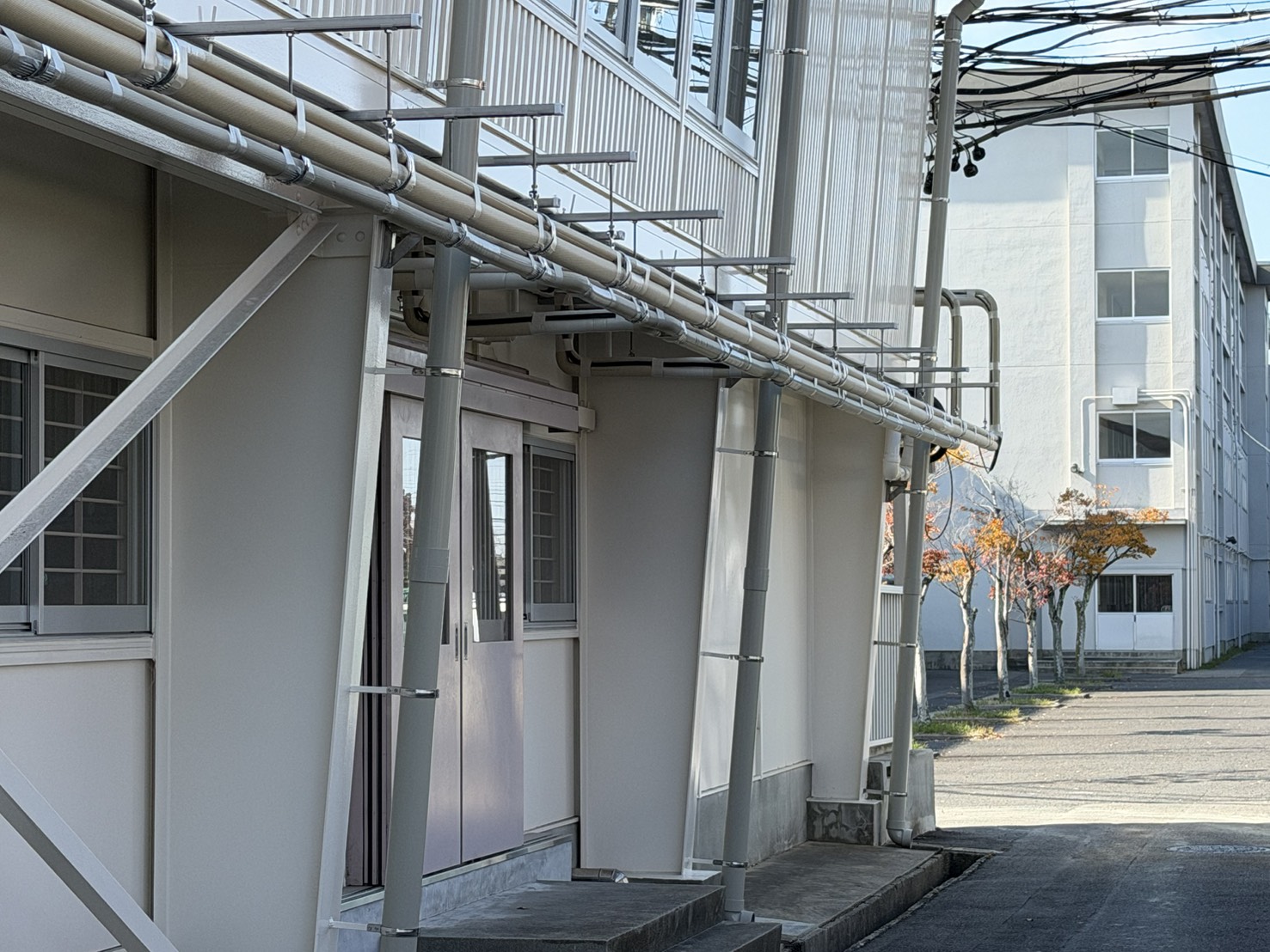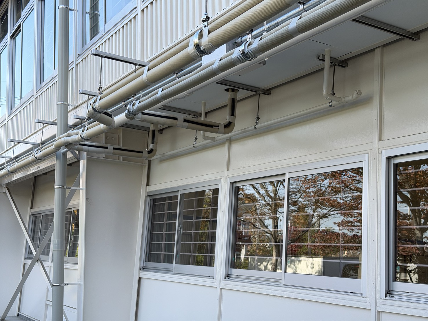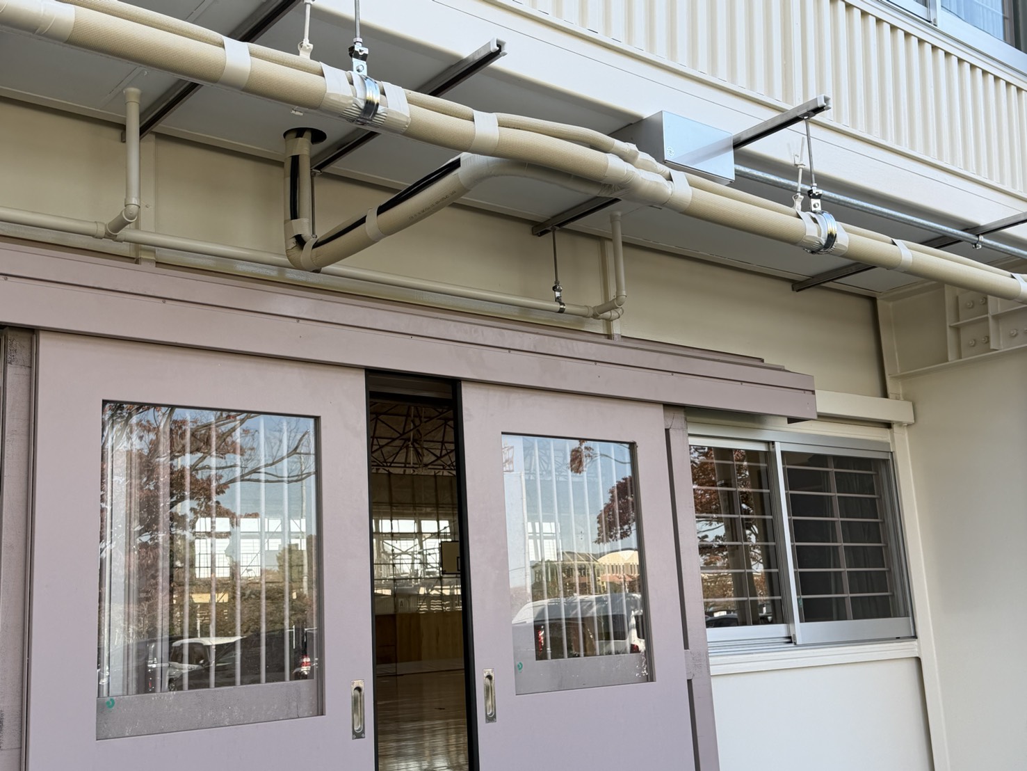 詳細:業務用エアコンを体育館に設置し、また、配管を外回りに延ばし室外機を設置いたしました。